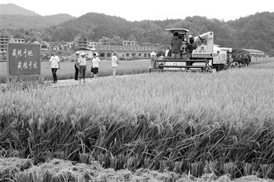 8月7日,在湖南省邵阳市隆回县羊古坳镇雷峰村超级杂交水稻高产攻关科研基地,农机手驾驶收割机收割再生稻。