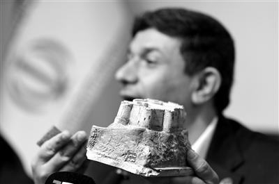 3月31日,在伊朗首都德黑兰,伊朗联合国教科文组织全国委员会秘书长哈桑·法尔图西手持法拉克·奥尔·阿夫拉克城堡的模型出席新闻发布会。法拉克·奥尔·阿夫拉克城堡近日在美国和以色列发动的袭击中受损。法尔图西还说,多所伊朗高校在美以袭击中受损,相关案例共记录149起,其中包括伊斯法罕理工大学、伊斯法罕艺术大学和伊朗科技大学等。