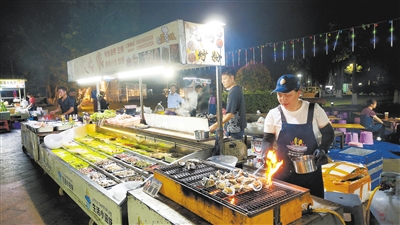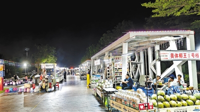 比赛结束,但精彩仍在延续。转身便是距离主场最近的奥体小夜市——坐落于五环广场北侧,经过标准化升级改造,现有160余个固定摊位。